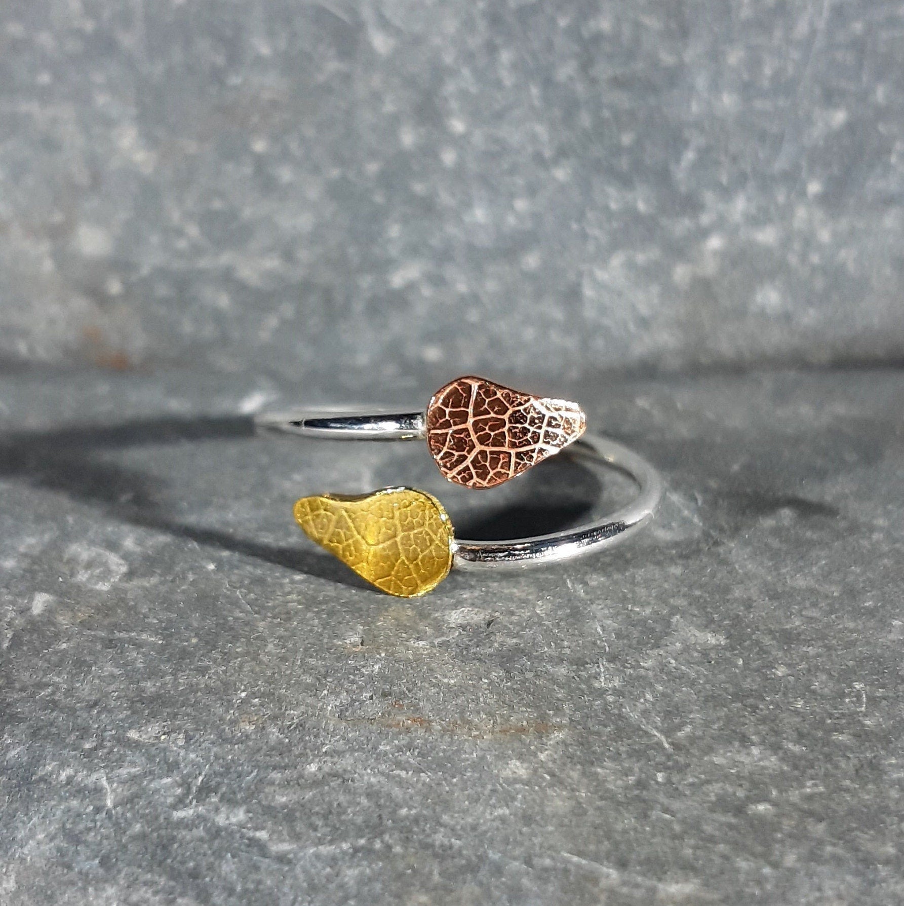 Adjustable Silver Ring With Copper And Brass Textured Leaf
