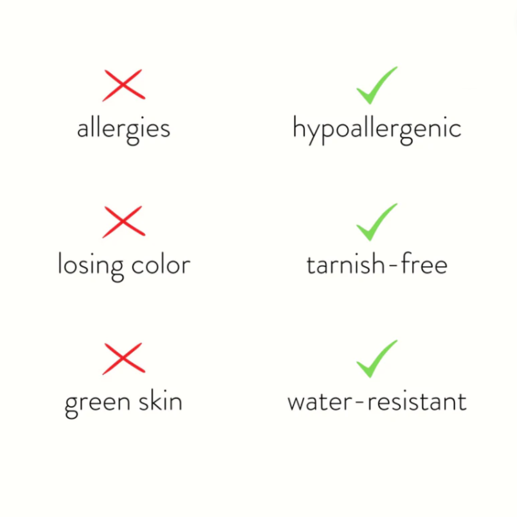 Our jewelry is durable, skin-friendly, tarnish-resistant and waterproof. Each piece is carefully crafted to maintain its shine and provide lasting comfort for everyday wear.